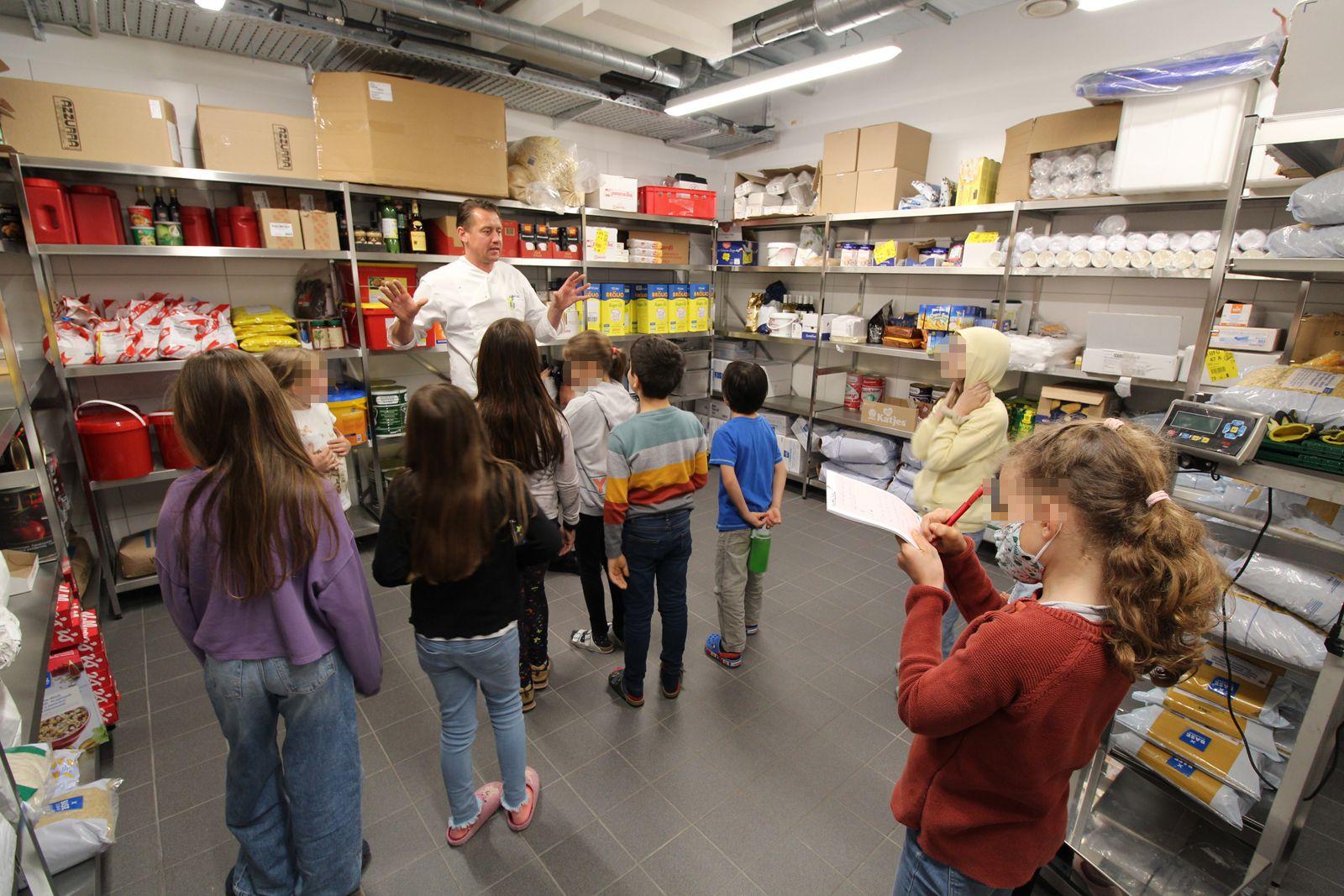 Da sahen wir den großen Kochtopf in den 160 Liter hinein passen, außerdem kann man ihn elektrisch kippen. Der Küchenleiter Herr Mayer zeigte uns die halbrunde Küche, wir fanden sie schön aber auch sehr unpraktisch.
