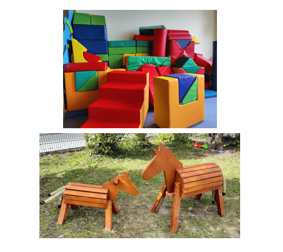 In unserem Garten sind ein Pferd und ein Pony aus Holz eingezogen, die liebevoll von den Kindern bespielt und gepflegt werden.