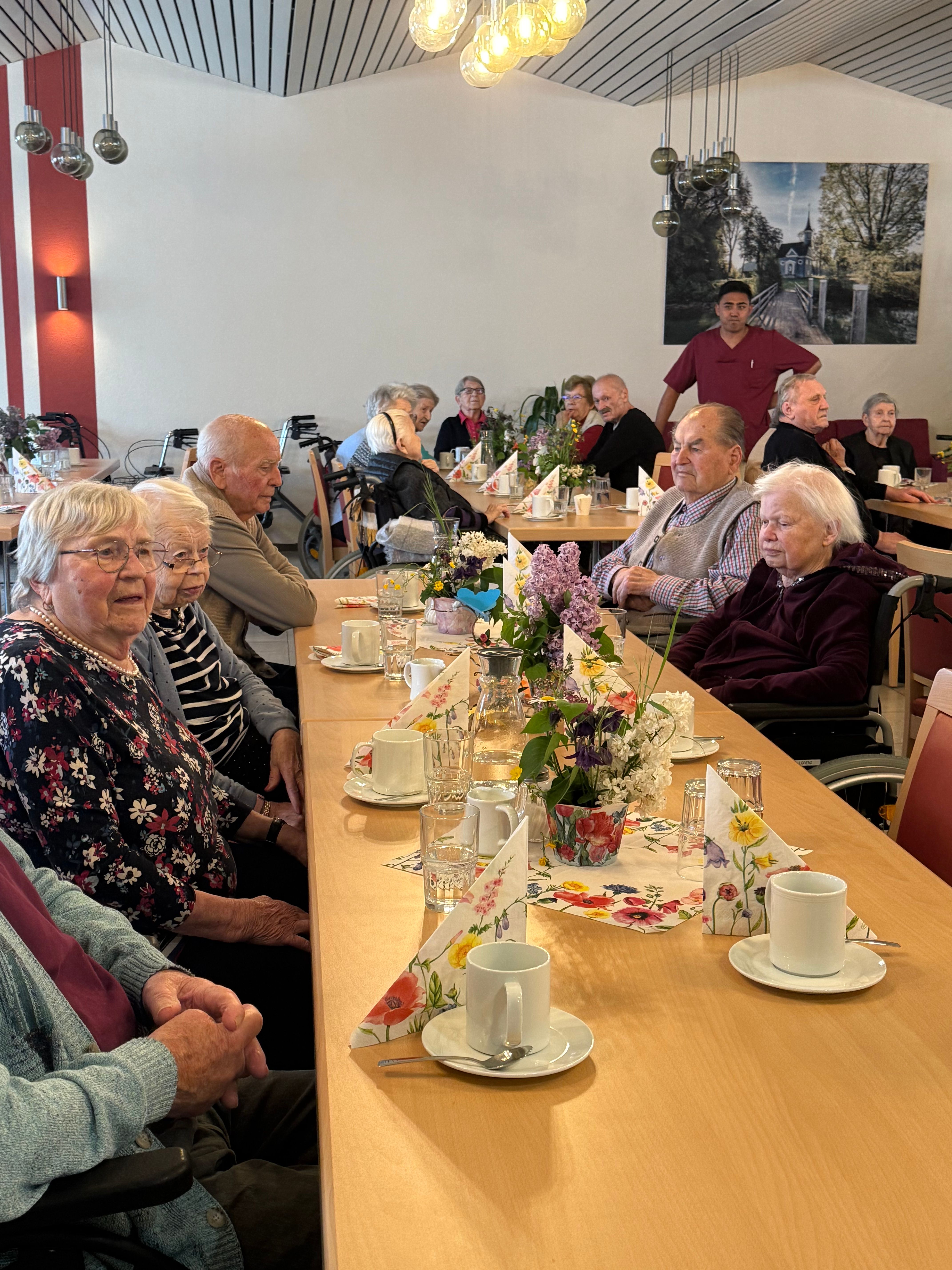 Das Betreuungsteam eröffnete das Fest mit „Komm, lieber Mai und mache…“ (W.A. Mozart). Danach gab es erstmal Cafe und saftigen Erdbeerkuchen. Schließlich war es endlich soweit und die Bewohnerinenn und Bewohner starteten ein lebhaftes Tänzchen um den Maibaum. Dabei waren Rollatoren und Rollstühle kein Hindernis!